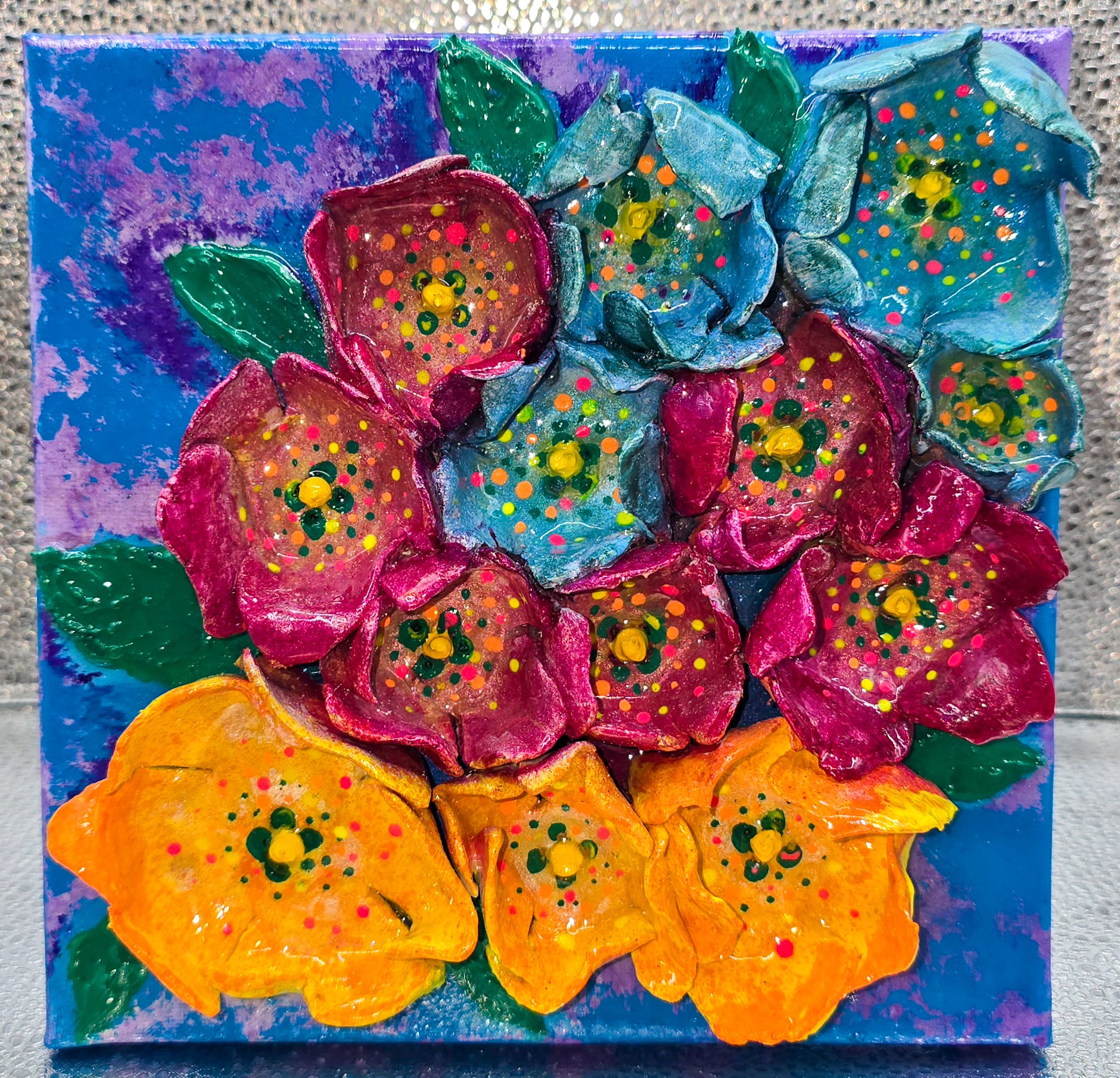 Multimedia piece I hand sculpted every flower and inside with clay used mica poweders and acrylics to really capture a rainbow of beauty..i also took some modeling paste and created leaves from that substrate
